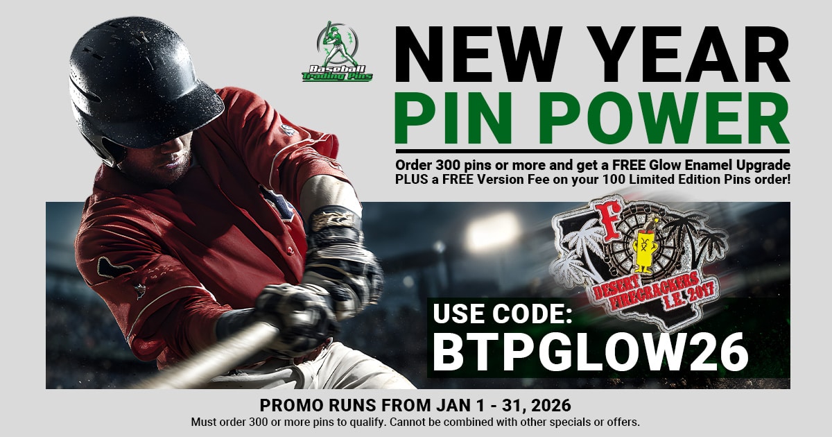 Order 300 pins or more and get a FREE Glow Enamel Upgrade plus a FREE Version Fee on your 100 Limited Edition pins order. Offer valid January 1 through January 31, 2026. Use the code below on our quote form to apply.